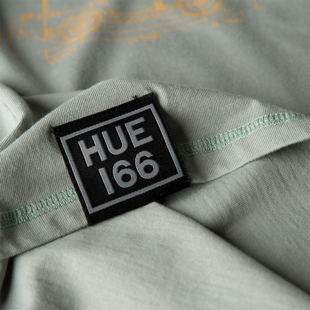100% cotton Jersey. Technical Drawing of the famous HUE 166 on the chest. HUE woven label on the sleeve. Choose from Green or Grey.