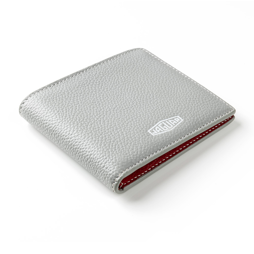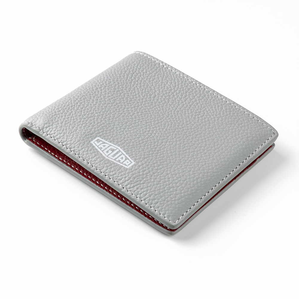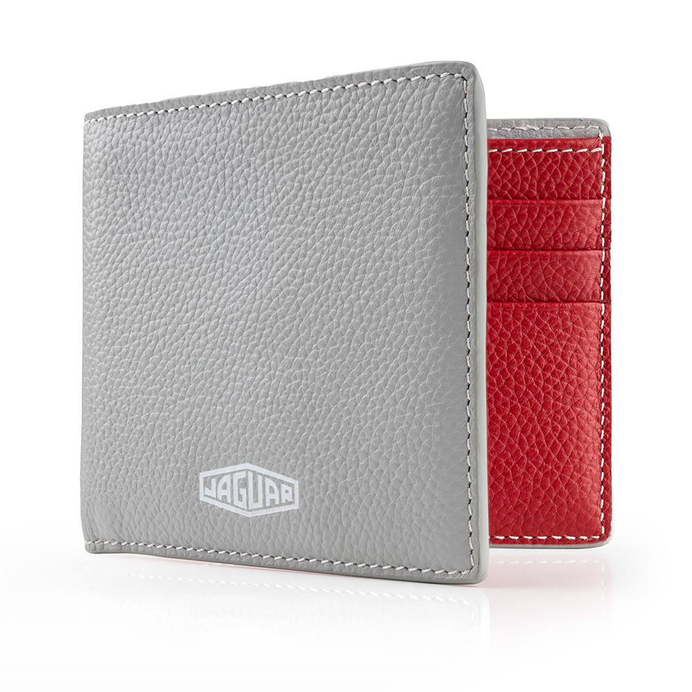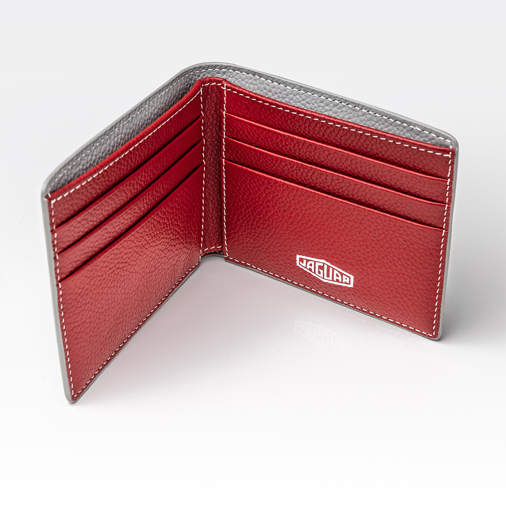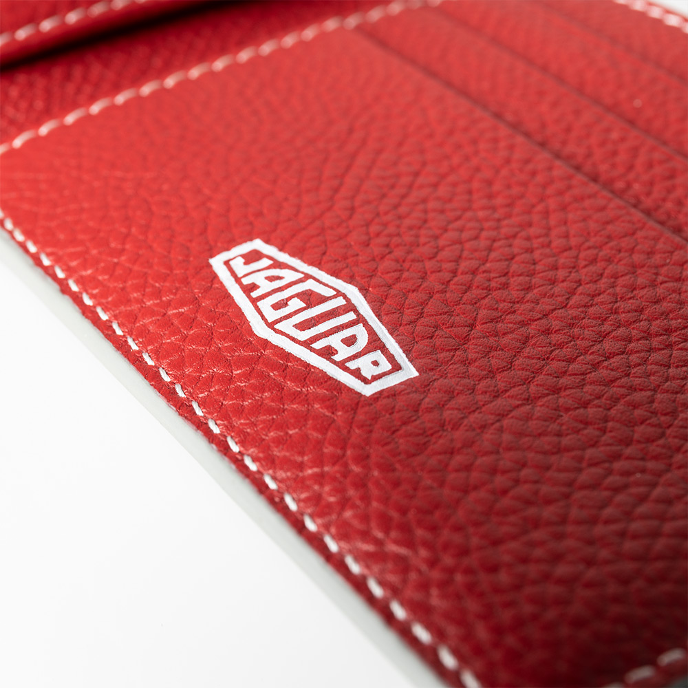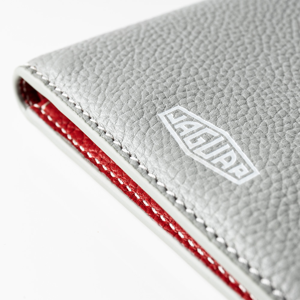 Statement wallet crafted from soft-touch Nappa leather. Inspired by the E-type’s legendary colourways, it features an aluminium-look exterior, with a classic red interior and lining. Finished with a printed Jaguar lozenge.