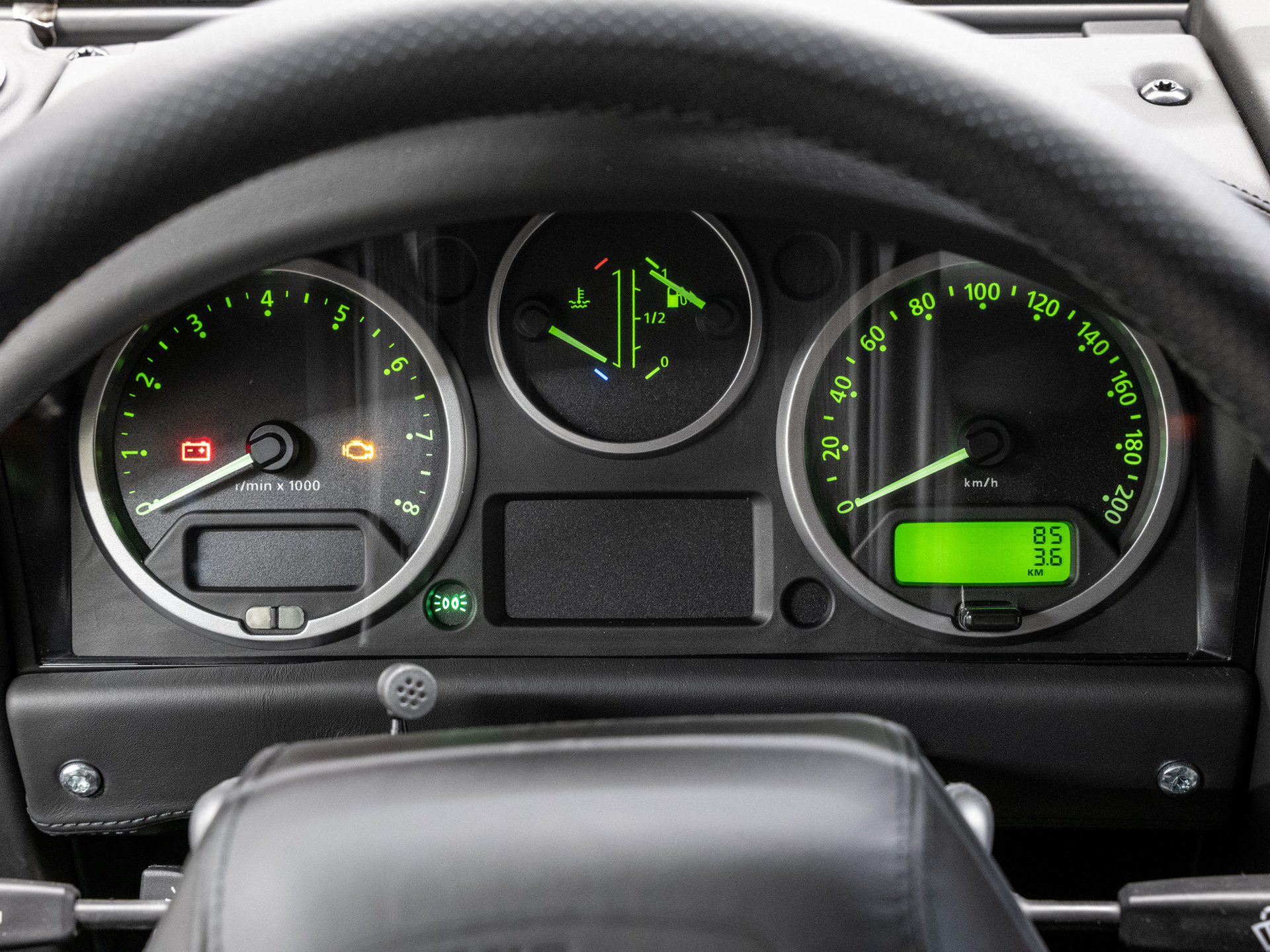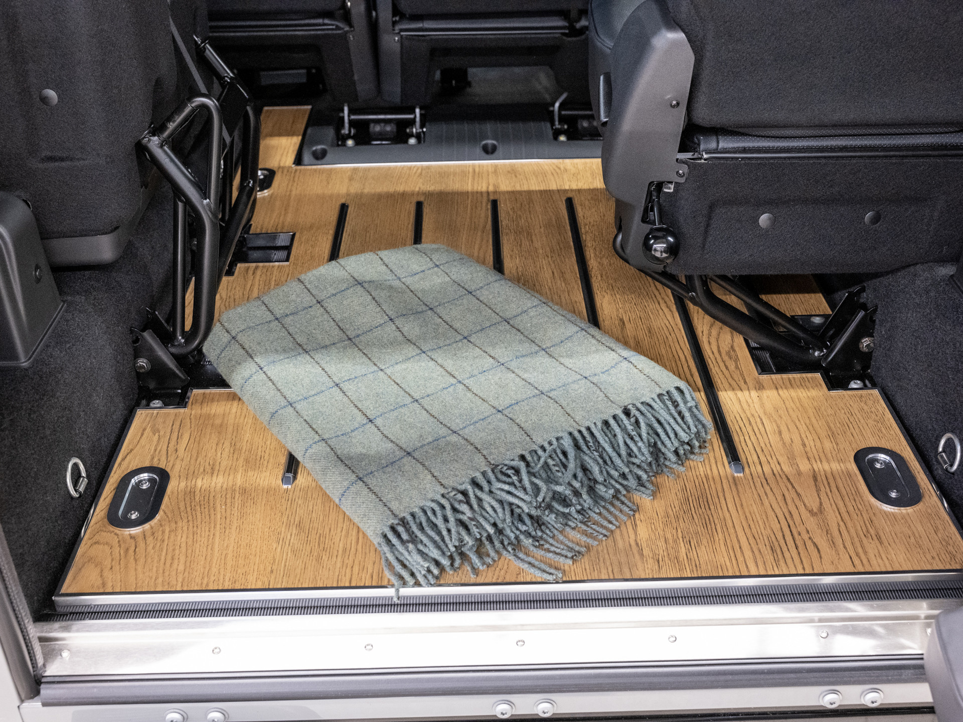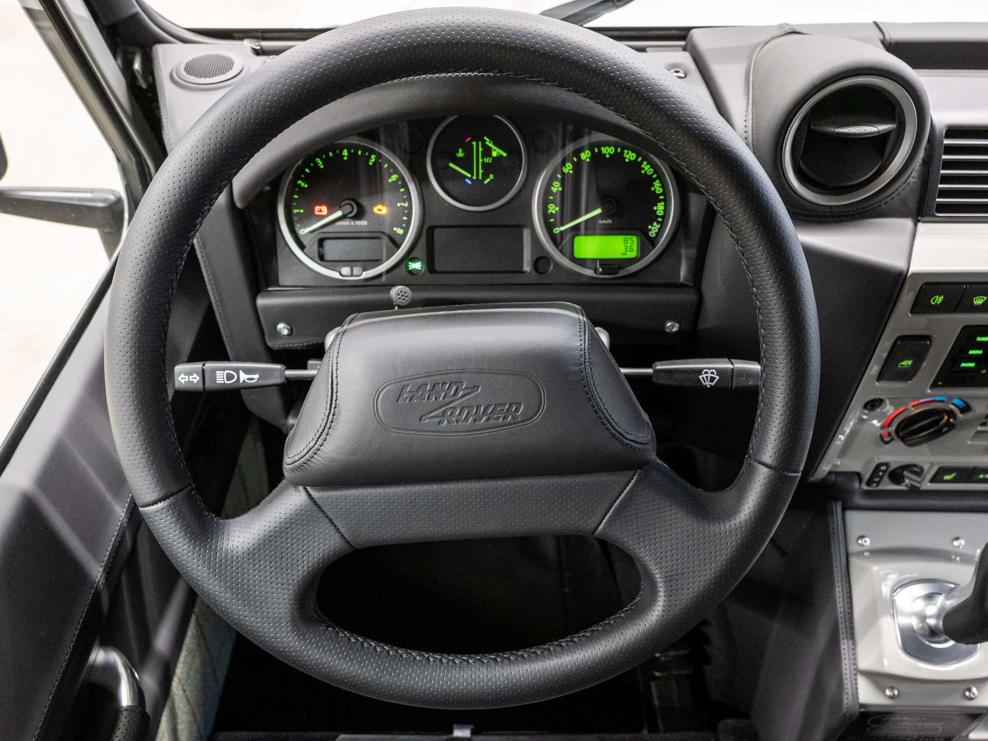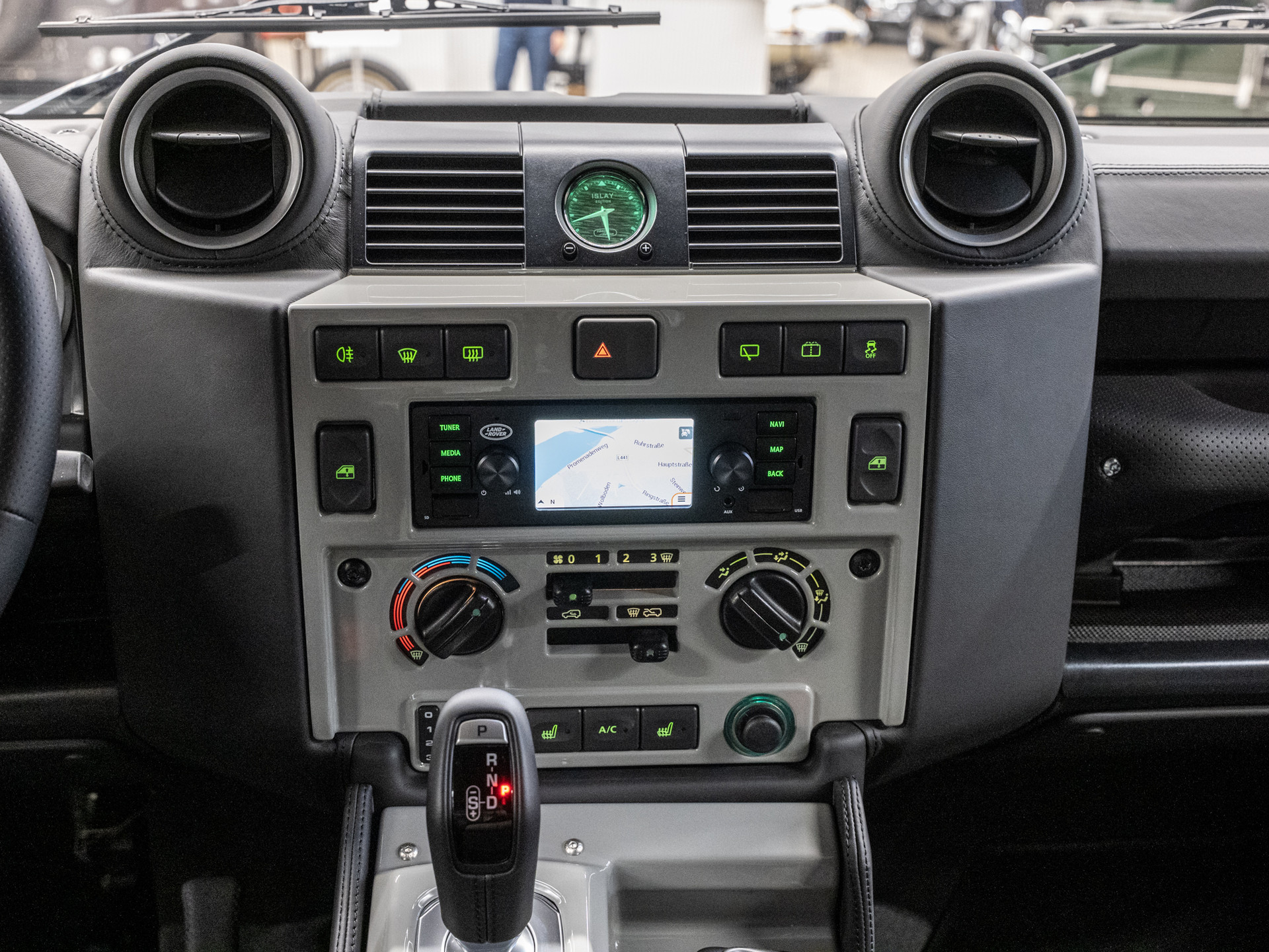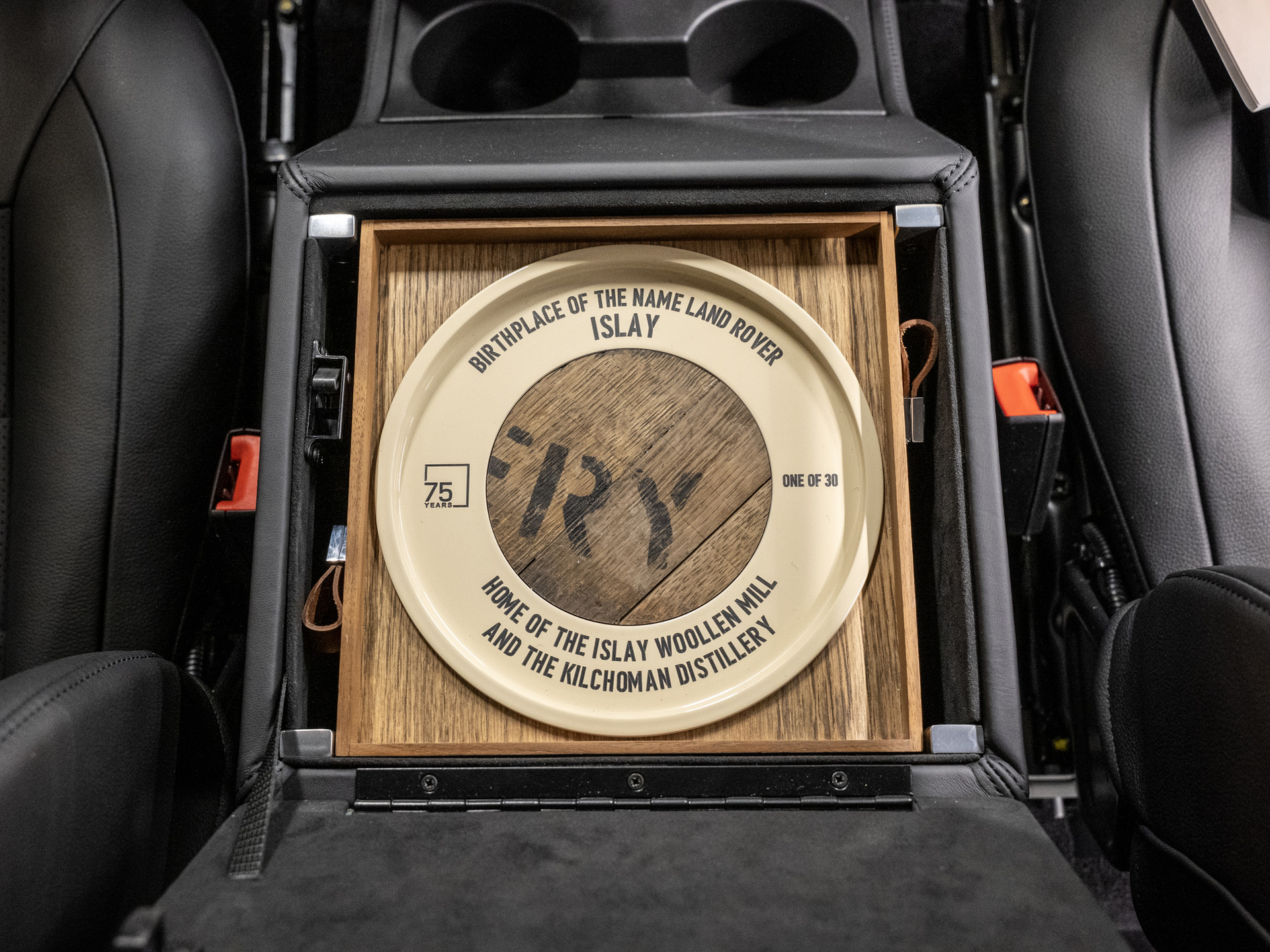 A removable console tray secured with leather straps incorporates oak reclaimed from whisky casks sourced from the local Kilchoman distillery, founded in 2005 by Spencer Wilks’ granddaughter, Kathy Wills, and her husband Anthony. Each compartment contains a wooden disc modelled on a cask end, marking the limited production run of just 30 vehicles and celebrating the 75th anniversary of the Land Rover brand. Oak trim continues throughout the cabin, extending to the rear load space and surrounding the clock, completing an interior crafted with exceptional attention to detail.