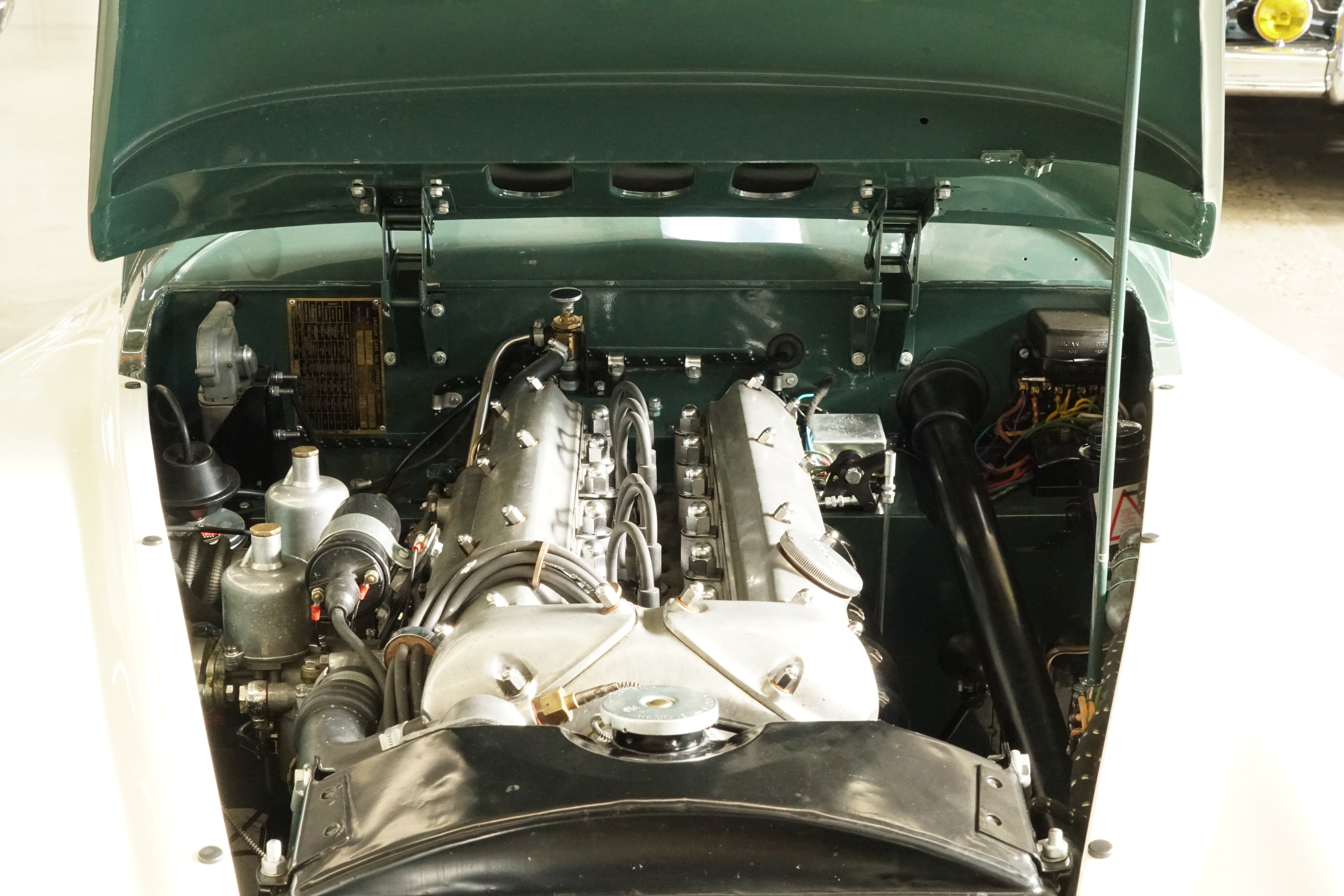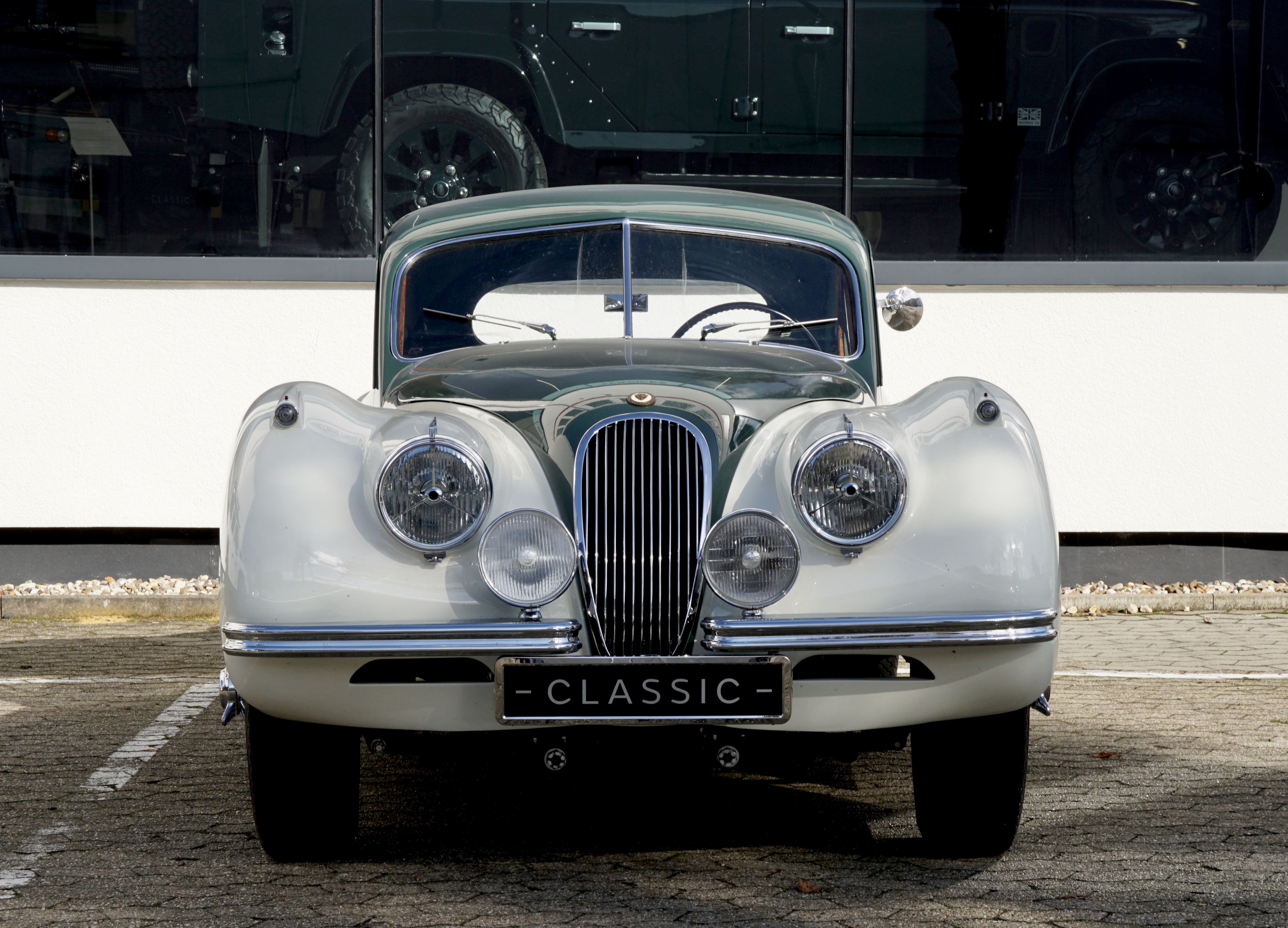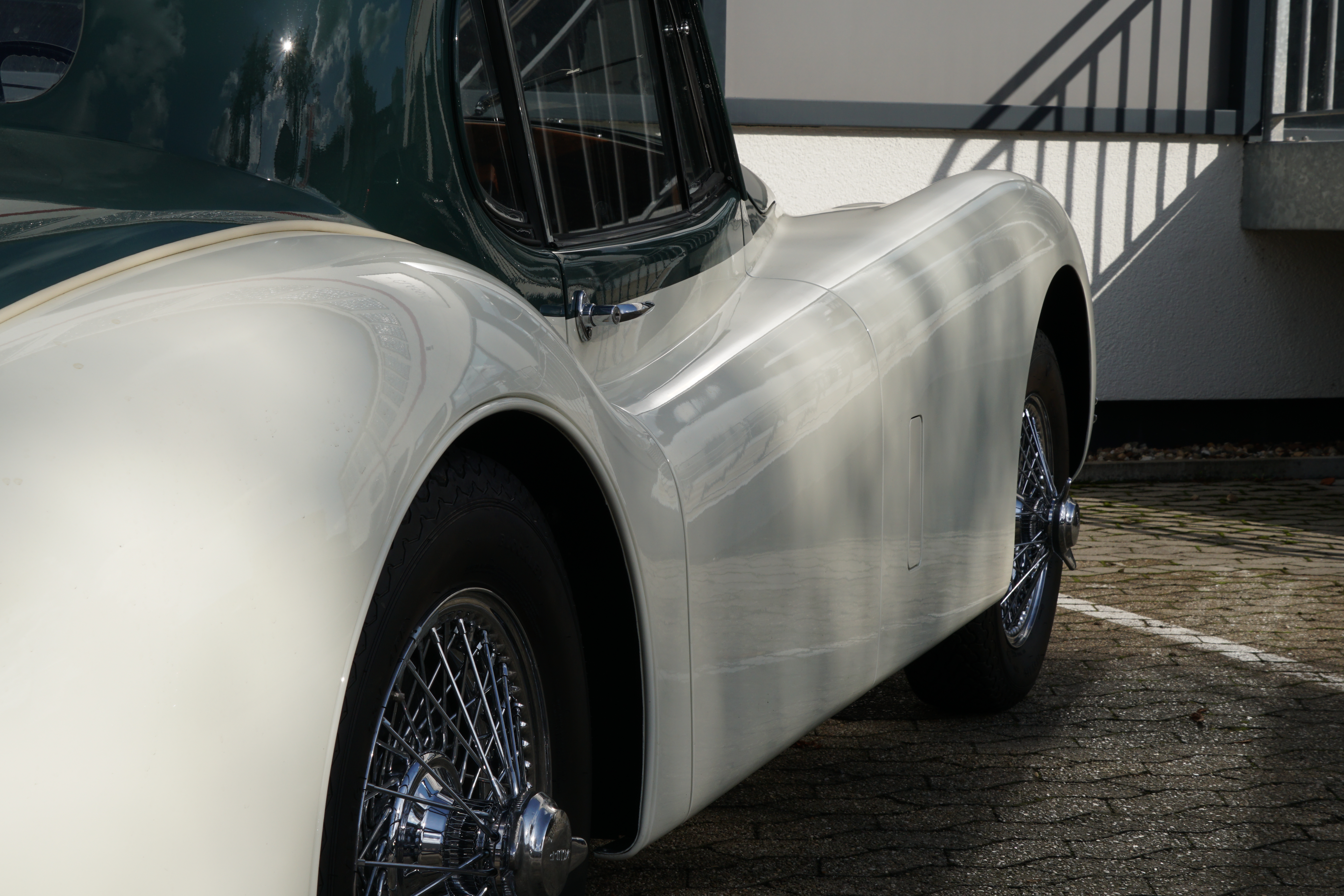 Fantastic XK 120 DHC in the colour combination Green over Cream/ Interior Suede with full Matching Numbers and rounded off by the matching chrome spoke rims. This colour combination, which was demonstrably the only one ever produced in its original form, was inspired by Sir Sterling Moss' XK120 FHC.