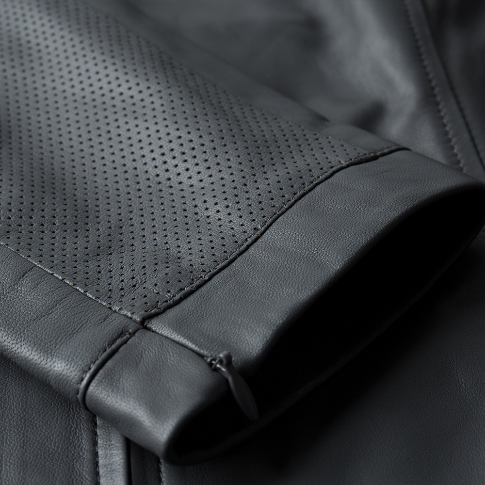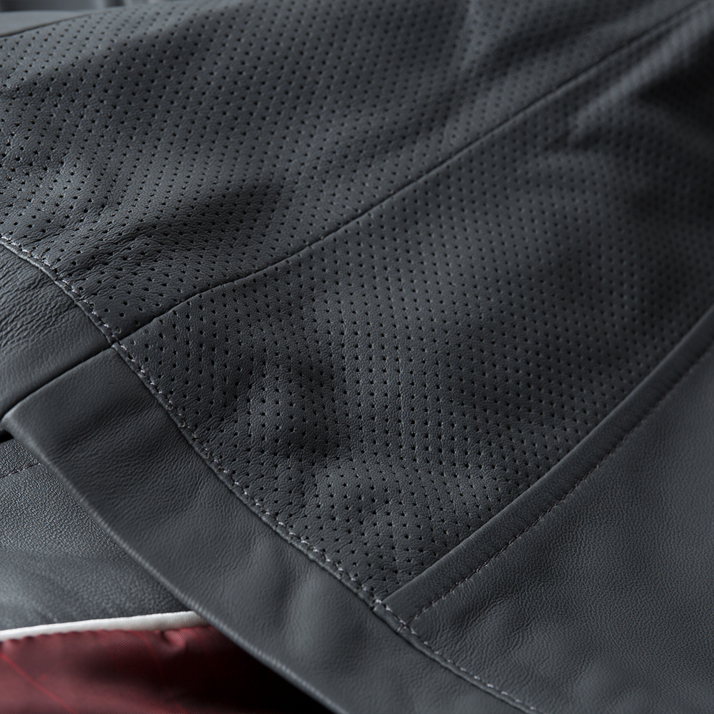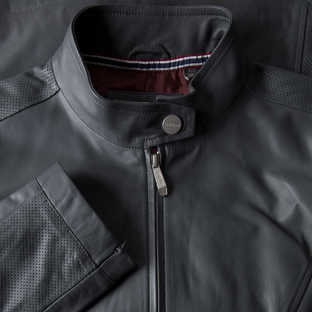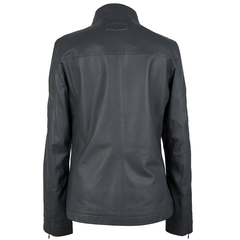 Women's tailored fit leather Jacket in Grey, with embossed Heritage logo, printed Heritage lining and perforated leather details. Available in sizes 8 to 20.